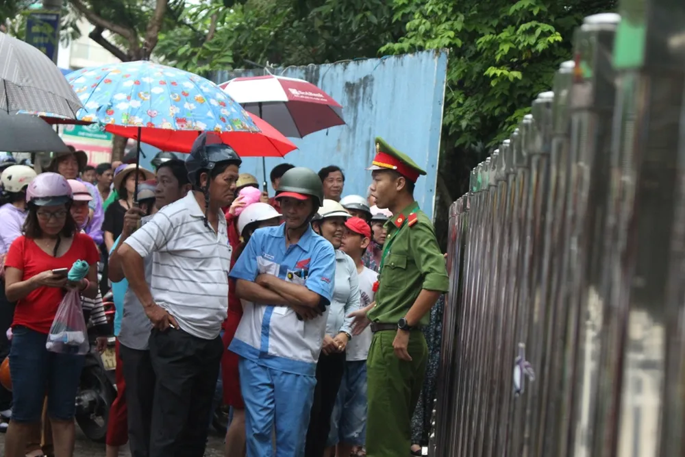 Nhiều phụ huynh tỏ ra nôn nóng, đứng sát cổng trường khiến lực lượng chức năng phải làm việc khá vất vả.