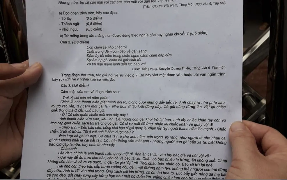 Em Trần Nguyễn Bảo Hằng (Trường THCS Lê Hồng Phong, Quảng Nam) cho biết đề văn năm nay vừa sức và khá thú vị khi sử dụng hình ảnh con chim sẻ “chết trong đêm cơn bão” trong bài thơ Tiếng vọng của Nguyễn Quang Thiều để nói về sự vô cảm, thờ ơ của con người trước những số phận bất hạnh trong cuộc sống.