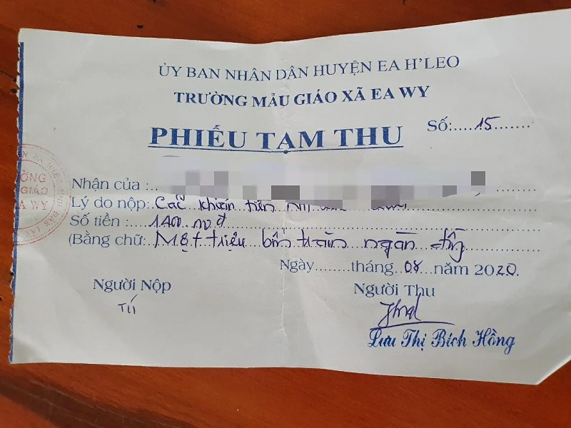 “Hiện nay nhà trường chưa thống kê được có bao nhiêu phụ huynh đã nộp tiền, do vẫn đang tuyển sinh. Khi đi từng thôn buôn để tuyển sinh, có phụ huynh nào nhờ thì mình mới thu, không thì thôi. Khi thu tiền thì mình có ghi giấy tạm thu” - bà Hằng nói.