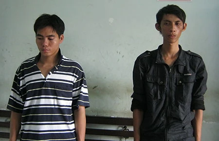 Trần Ngọc Giàu (trái) và Cao Minh Tuấn bị bắt giữ tại cơ quan công an. Ảnh: CTV
