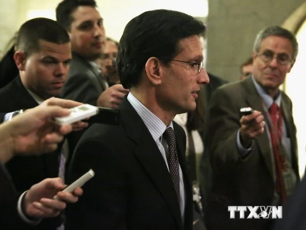 Lãnh đạo thiểu số Hạ viện Mỹ, nghị sỹ Eric Cantor (giữa) tại Washington, DC., ngày 11/10/2013. Ảnh: AFP