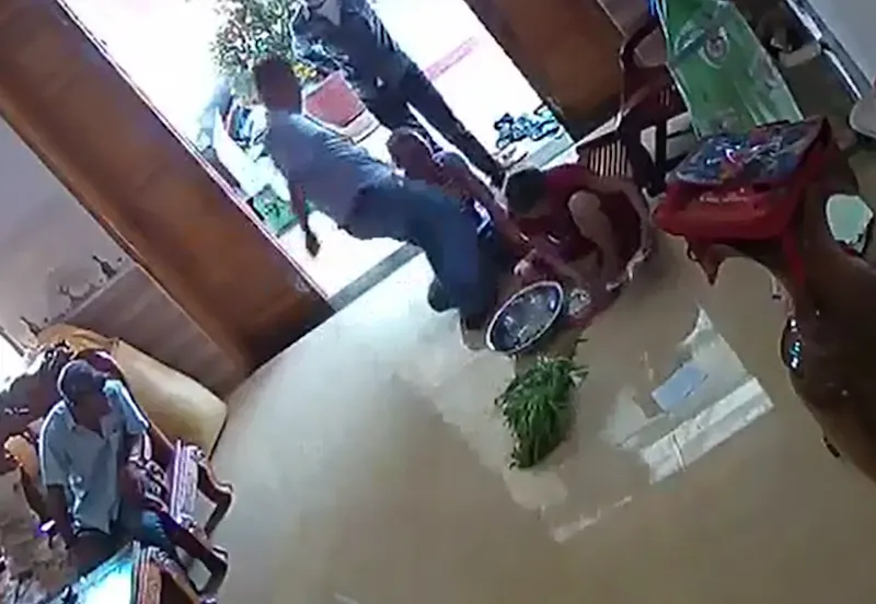 Lúc này, một người đàn ông trong nhóm đá thẳng vào mang tai, cổ bà Thoa khiến nạn nhân ngã nhào xuống đất. Hành động của đối tượng hết sức hung dữ.
