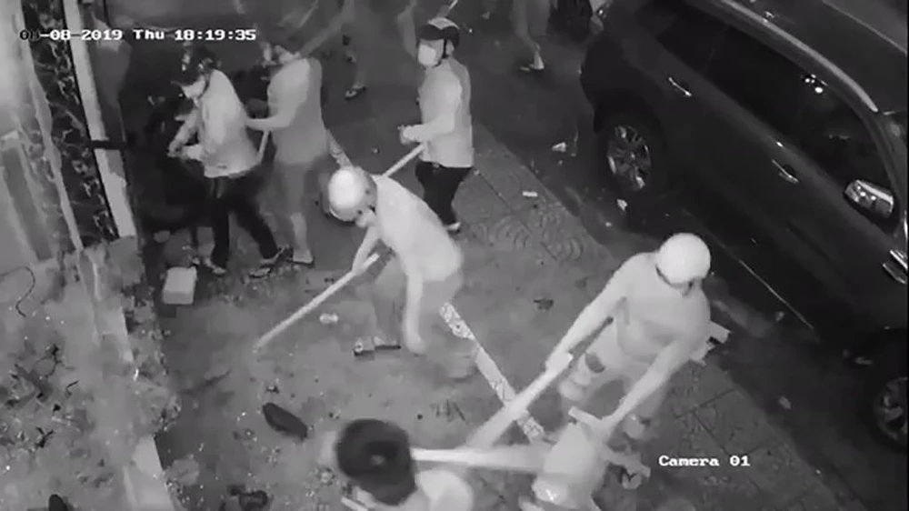 Nhóm côn đồ mang theo hung khí tấn công vào nhà hàng ở quận 1. Ảnh cắt từ clip.