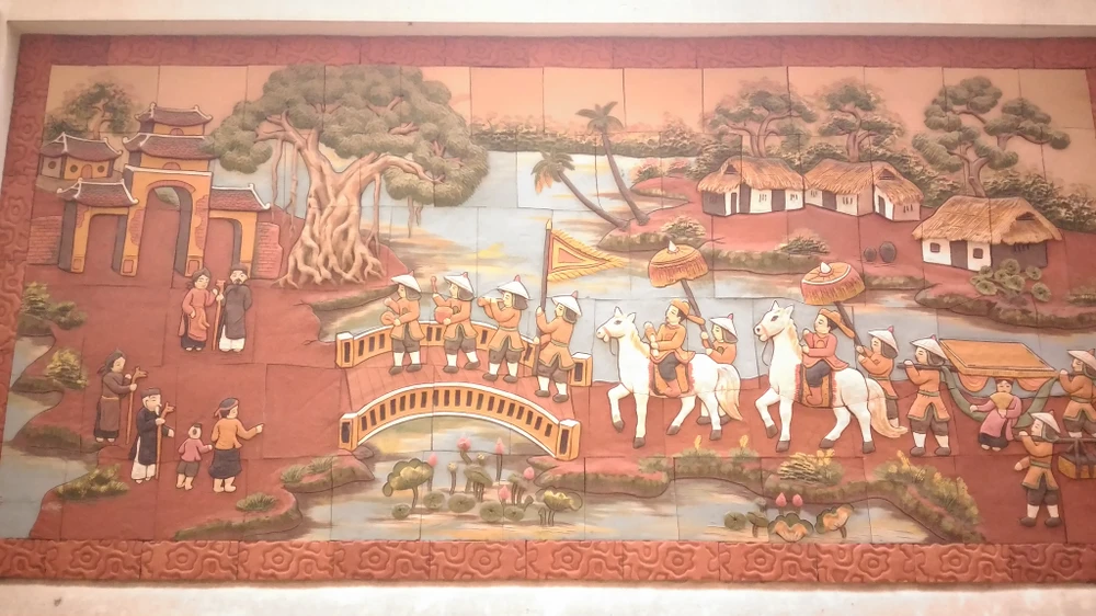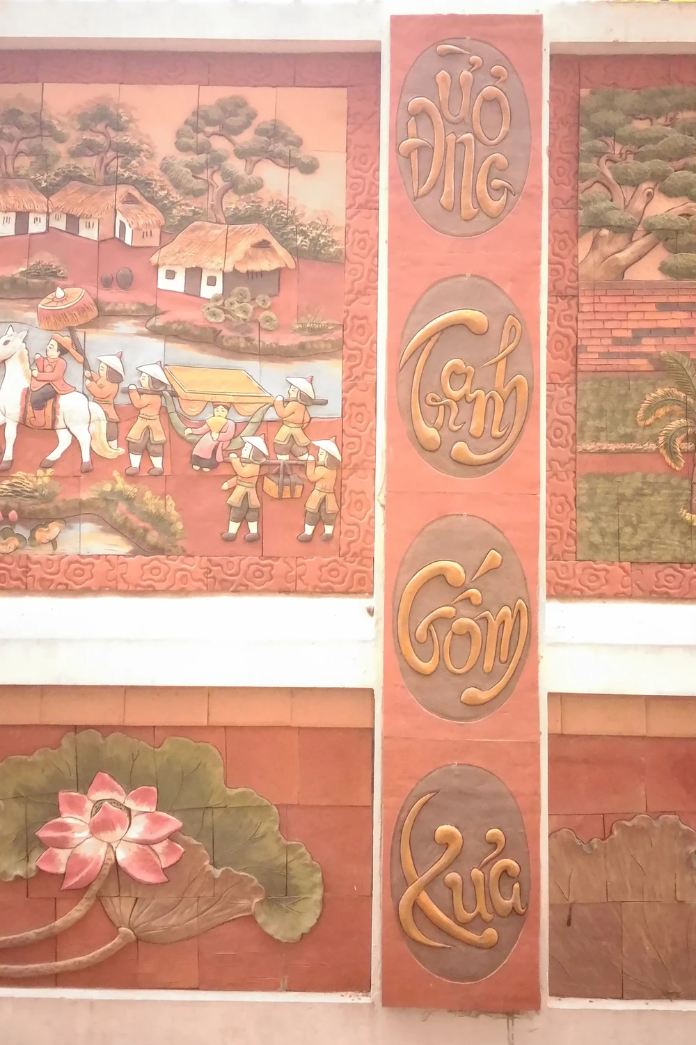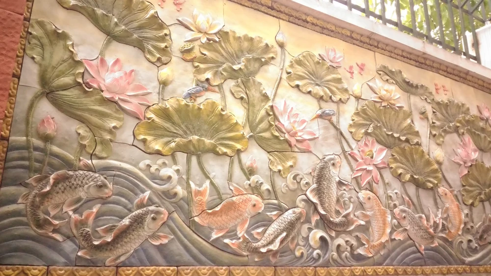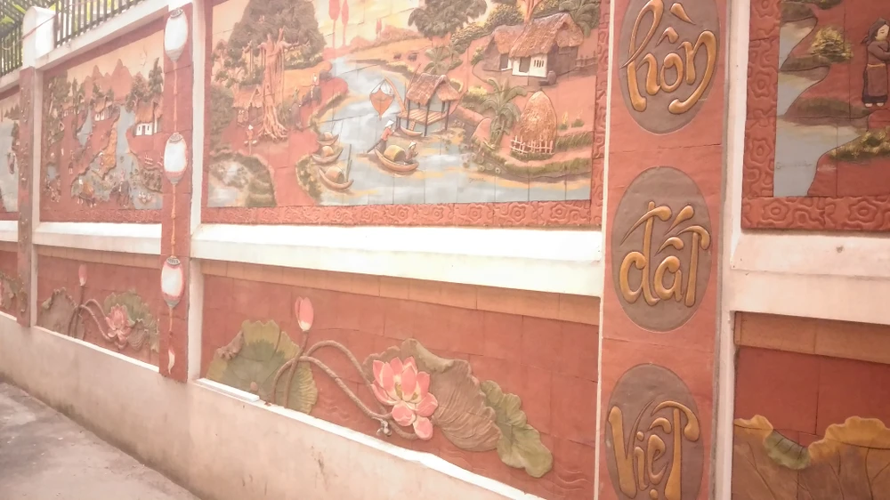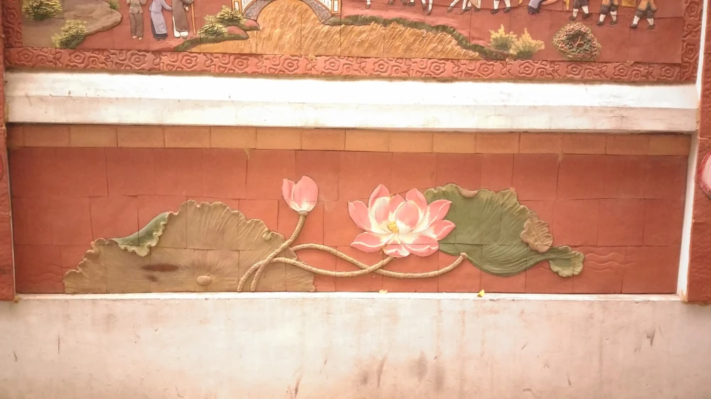 Bức tường được chia thành hai phần, phần trên là các bức tranh khổ lớn về phong cảnh non nước, làng quê hoặc đàn cá…; bên dưới là các bức nhỏ, hình hoa sen. Tất cả các bức tranh đều có màu chủ đạo là nâu đỏ, nổi bật trên nền tường màu trắng, vô cùng độc đáo và đẹp mắt.