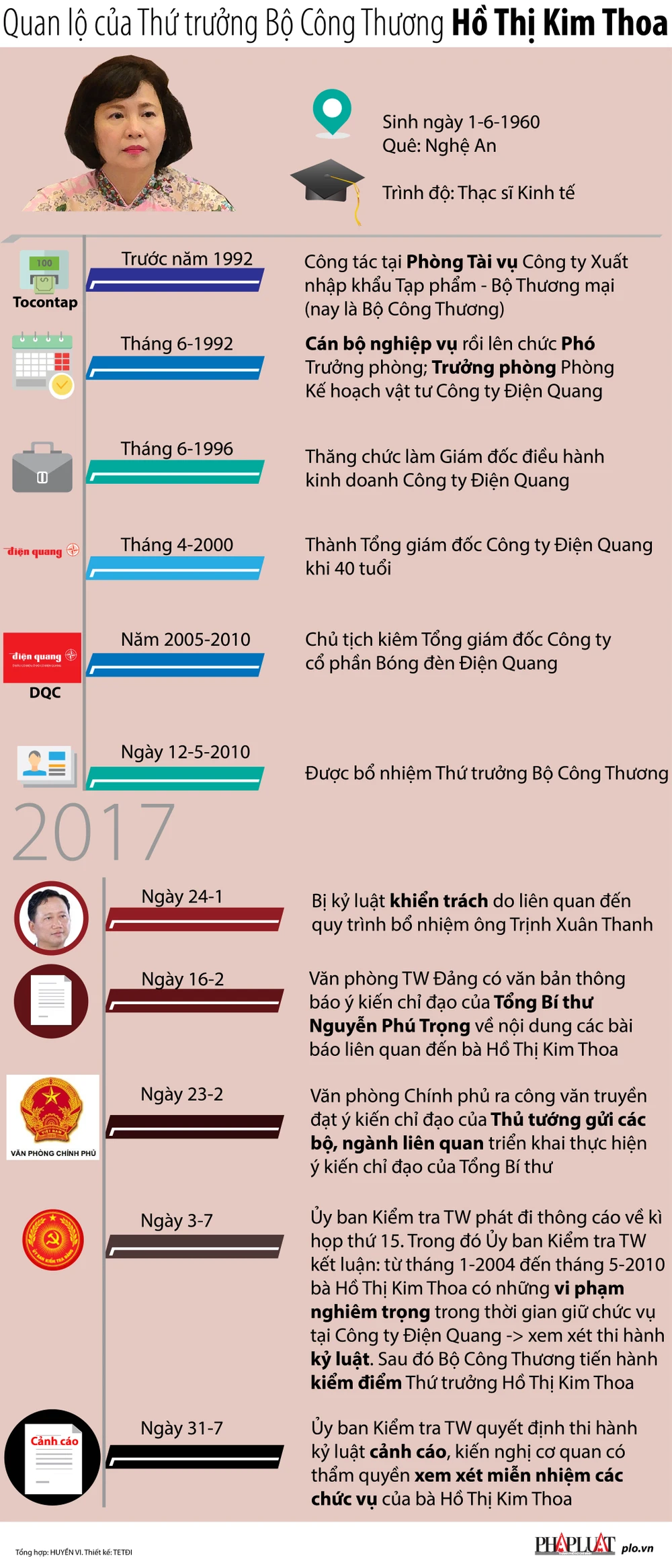 (PLO) - Là thạc sĩ kinh tế, bà Hồ Thị Kim Thoa có 18 năm gắn bó với Điện Quang trước khi trở thành Thứ trưởng Bộ Công thương. Ngày 31-7, Ủy ban Kiểm tra Trung ương quyết định thi hành kỷ luật cảnh cáo đối với bà Thoa, đồng thời kiến nghị cơ quan có thẩm quyền xem xét miễn nhiệm các chức vụ hiện nay của Thứ trưởng Bộ Công thương, Hồ Thị Kim Thoa.