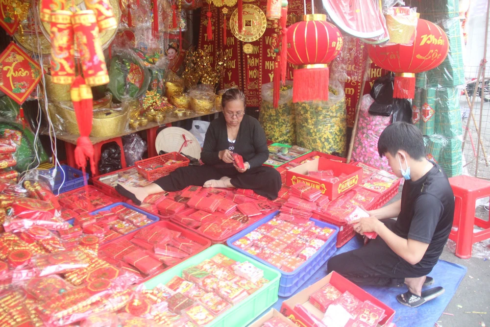 Những ngày này con phố luôn ngập trong sắc đỏ, tấp nập kẻ bán, người mua. Chủ các cửa hàng ở đây cho biết họ phải thuê thêm nhân công để soạn hàng, giao hàng cho khách cũng như phụ bán, trông coi cửa hiệu. Giá một ngày công từ 300.000 đồng/ngày