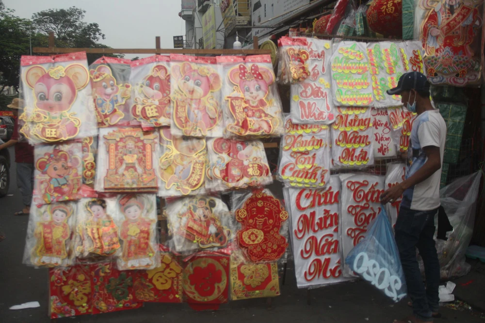 Khắp con phố, đồ trang trí tết như dây may mắn, miếng dán hình chuột may mắn, câu đối đỏ, đồng tiền… vẫn được bày bán dù đã giáp tết Canh Tý. Giá của các mặt hàng này dao động từ 10.000-350.000 đồng/cái tùy loại.