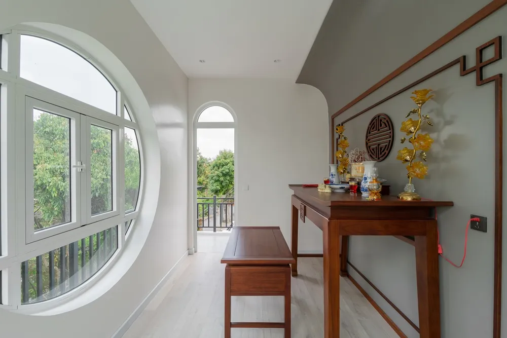 Tầng hai gồm phòng khách nhỏ, phòng ngủ, phòng thờ, ban công.
