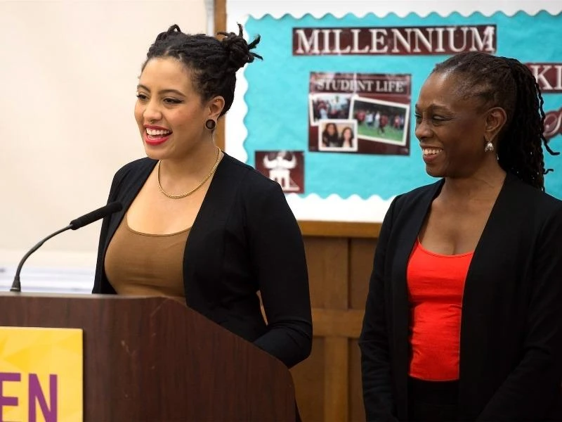Cô Chiara de Blasio đứng cạnh mẹ là bà Chirlane McCray trong một sự kiện dành cho lứa tuổi thiếu niên vào năm 2015. Ảnh: VĂN PHÒNG THỊ TRƯỞNG TP NEW YORK