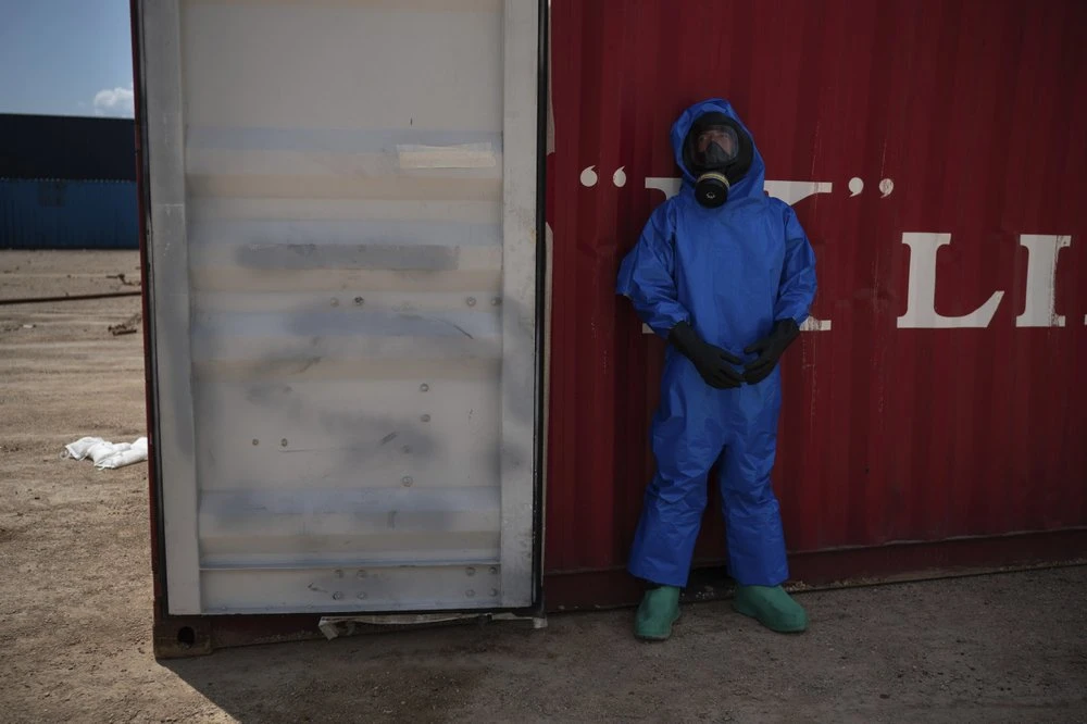 Nhân viên cứu hộ của Pháp đứng cạnh thùng chứa hóa chất dễ gây cháy tại cảng Beirut. Ảnh: AP