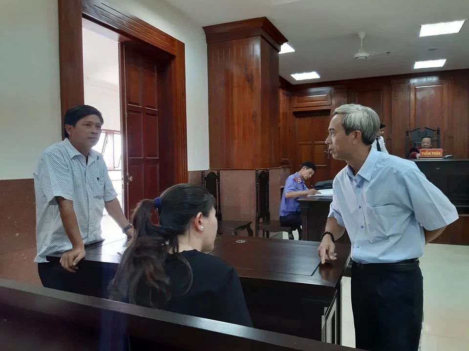 Nguyên đơn và bị đơn (bên phải) trao đổi khi toà nghị án. Ảnh: H.Y