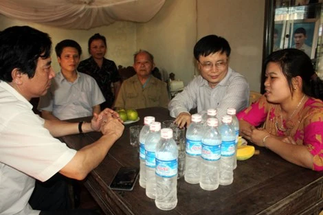 Ông Bùi Đình Long (đeo kính), Giám đốc Sở Y tế Nghệ An dẫn đầu đoàn lãnh đạo Sở thăm hỏi gia đình chị Ninh vào chiều 17/3, đồng thời công bố việc tiếp nhận em Trang vào công tác tại BVĐK Diễn Châu (Nghệ An). Ảnh VietNamNet