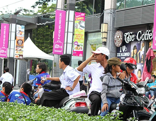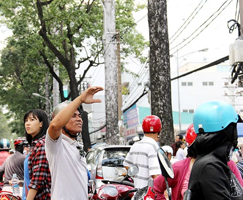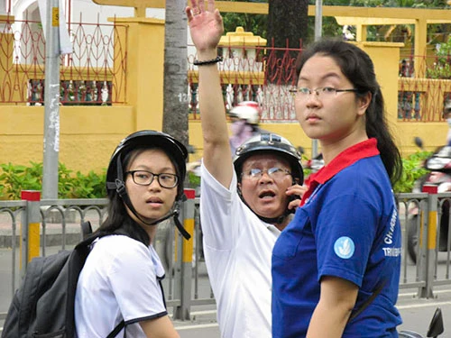 Phụ huynh í ới gọi điện ra dấu cho con biết chỗ đợi - Ảnh: Phước Tĩnh