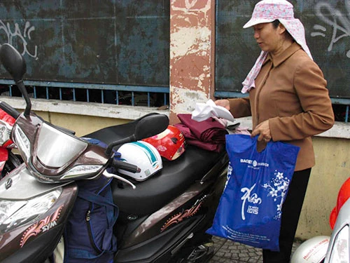 Người mẹ đến từ Đồng Nai chuẩn bị áo mưa cho con vì sợ chiều nay trời Sài Gòn đổ mưa to - Ảnh: Phước Tĩnh