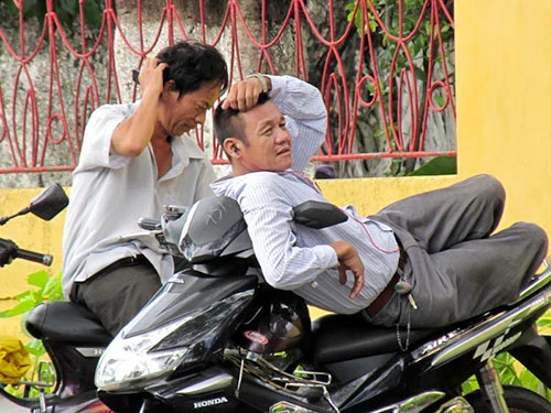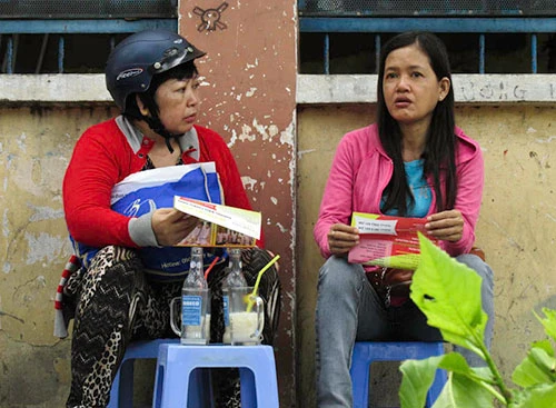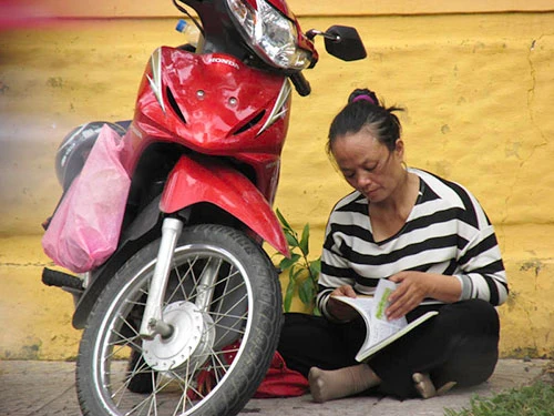Mẹ ngồi trên vỉa hè lật sách đọc, trong lúc chờ con dự thi- Ảnh: Phước Tĩnh