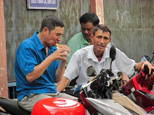 Ăn vội ổ bánh mì khi chờ con - Ảnh: Phước Tĩnh