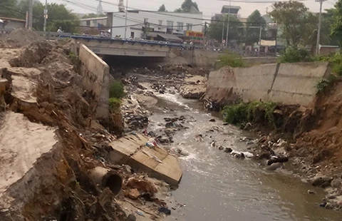 Chỉ một trận mưa trái mùa, bờ kè tiền tỉ đã tan hoang thế này. Ảnh: TIẾN DŨNG