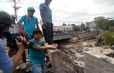 Khi kè gãy đổ thì chỉ lòi ra một thanh sắt nhỏ như ngón tay út nằm ngang khối bê tông. Ảnh: TIẾN DŨNG