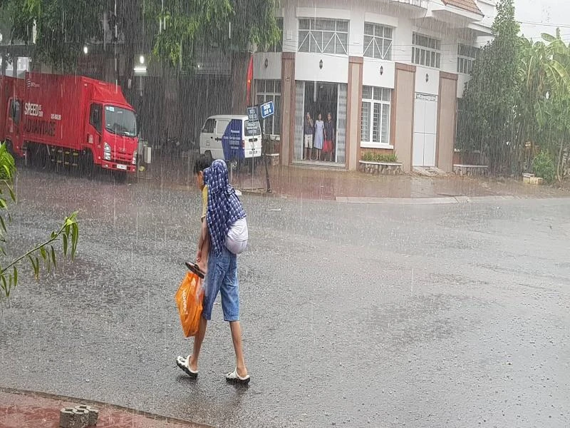 Cậu bé cõng em trên lưng đang đi thì bất ngờ cơn mưa trút xuống.