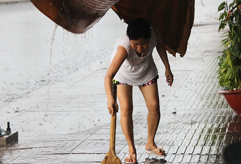 Người dân dùng chổi quét nước mưa ra ngoài. Ảnh: HOÀNG GIANG