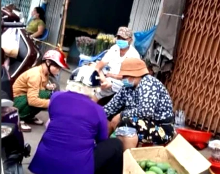 Tại con đường dẫn vô chợ Bà Điểm thuộc huyện Hóc Môn, PV thấy giăng dây cấm bán để ngăn ngừa dịch bệnh COVID-19. Tuy nhiên, PV ghi nhận vài người vẫn bày rau, củ, trái cây… để bán. Chưa hết, có 4 người ngồi sát lựa trái cây và nói chuyện rôm rả.