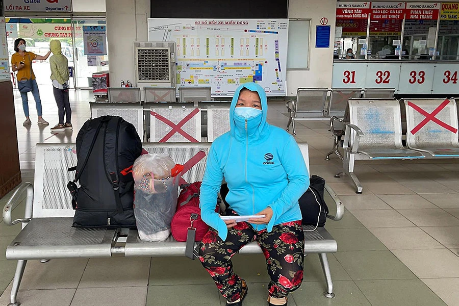 Chị Phạm Thị Luận cho biết: Nghe thông tin ngày 14-10 sẽ mở lại chuyến TP.HCM - Bình Định nên chị mừng lắm. Chị đã trả phòng trọ, bán toàn bộ đồ đạc có thể bán để lấy tiền mua vé về quê. 15 giờ xe mới xuất bến nhưng ngay từ sáng sớm vợ chồng chị đã có mặt ở bến chờ tới giờ khởi hành.