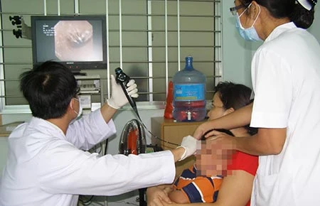 BS Đặng Hoàng Sơn, Trưởng khoa Tai mũi họng BV Nhi đồng 1, đang khám cho một trẻ bị viêm tai giữa. Ảnh: TRẦN NGỌC