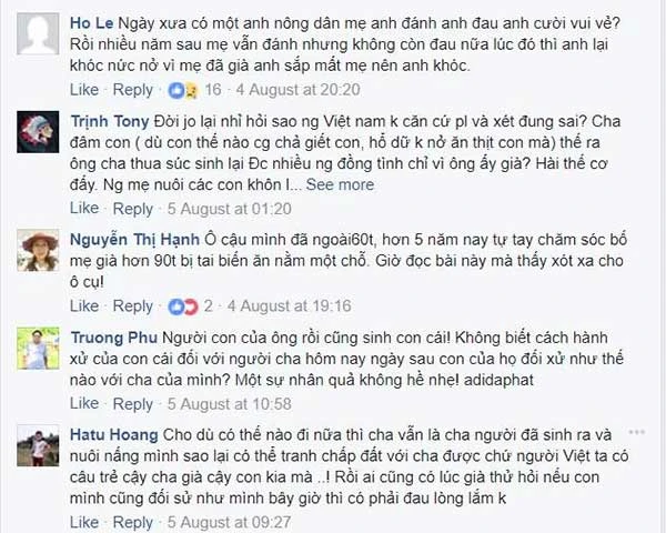 Bạn đọc cho rằng đây không phải trường hợp cần rạch ròi lỗi-phải mà bản chất mối quan hệ cha-con cần hành xử vị tình hơn. “Một giọt máu đào hơn ao nước lã”, “công cha như núi Thái Sơn”… là những căn cứ bạn đọc đưa ra để khẳng định con cái phải luôn hiếu thuận, không báo đáp được thì càng không thể đày đọa cha mẹ. Bạn Lê Nga buồn bã nói “có câu con không chê cha mẹ khó, chó không chê chủ nghèo. Có người mong biết cha mình là ai còn không được, đây thì…”.