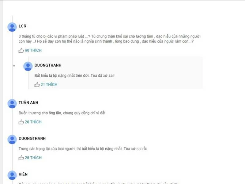Ý kiến phê phán nặng nề hành động của những người con trong vụ án chiếm tỉ lệ đến 90%. Các bạn Nhung, Huỳnh Tới, Lê Thanh Bằng, Loan Nguyen, Tran Ngoc Phuong… và hàng trăm độc giả khác cùng chung nhận định: “Công dưỡng dục sinh thành để bây giờ nhìn các con cắn xé nhau, đối xử tệ bạc với mình còn gì đau hơn?”, “đáng căm phẫn cho kẻ làm con đẩy cha già vào tù tội”, “trên đời tội lớn nhất là bất hiếu”…