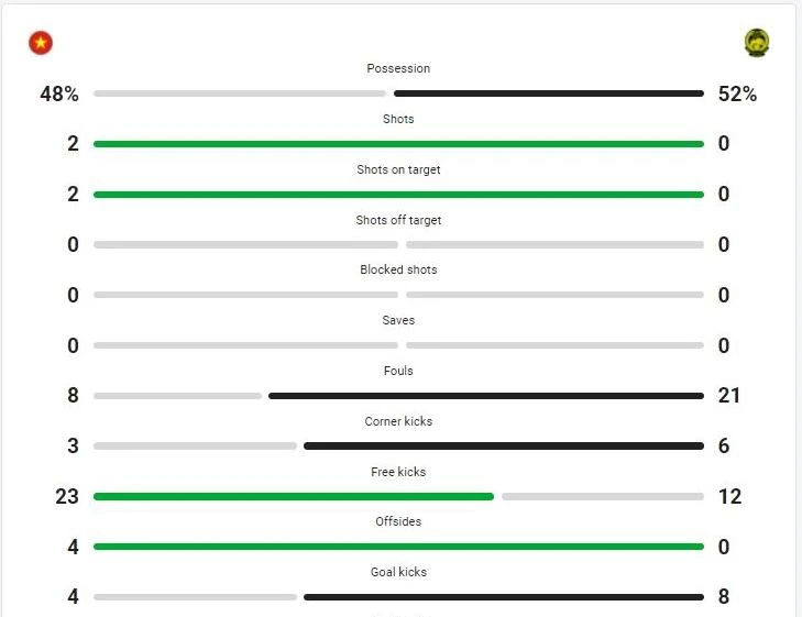 Ngay cả số lần hưởng phạt góc của Malaysia cũng nhiều hơn so với Việt Nam (6 lần so với 4).