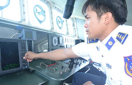 Thuyền trưởng Đàm Minh Khoa trước radar quan sát. Ảnh: TT