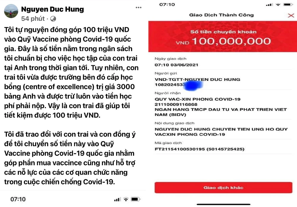 Ngay trong buổi tối, anh bàn với vợ dùng 100 triệu đồng vốn chuẩn bị làm học phí đóng góp vào Quỹ Vaccine COVID-19 của Nhà nước. Vợ anh đồng ý ngay. Con trai cũng đồng ý. Sáng ngày 3-6, anh chuyển ngay số tiền đó vào quỹ.