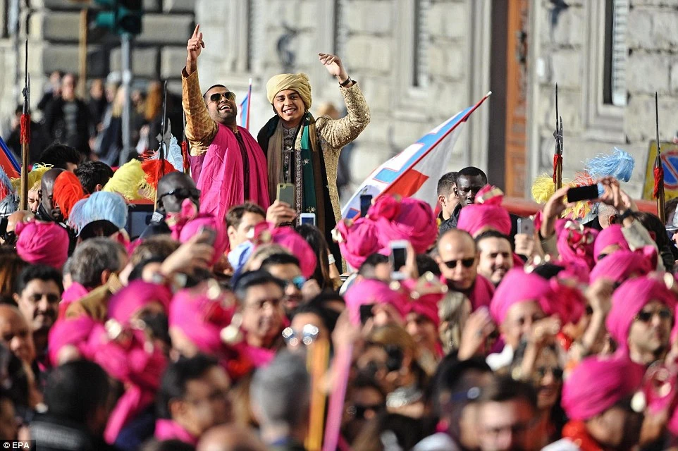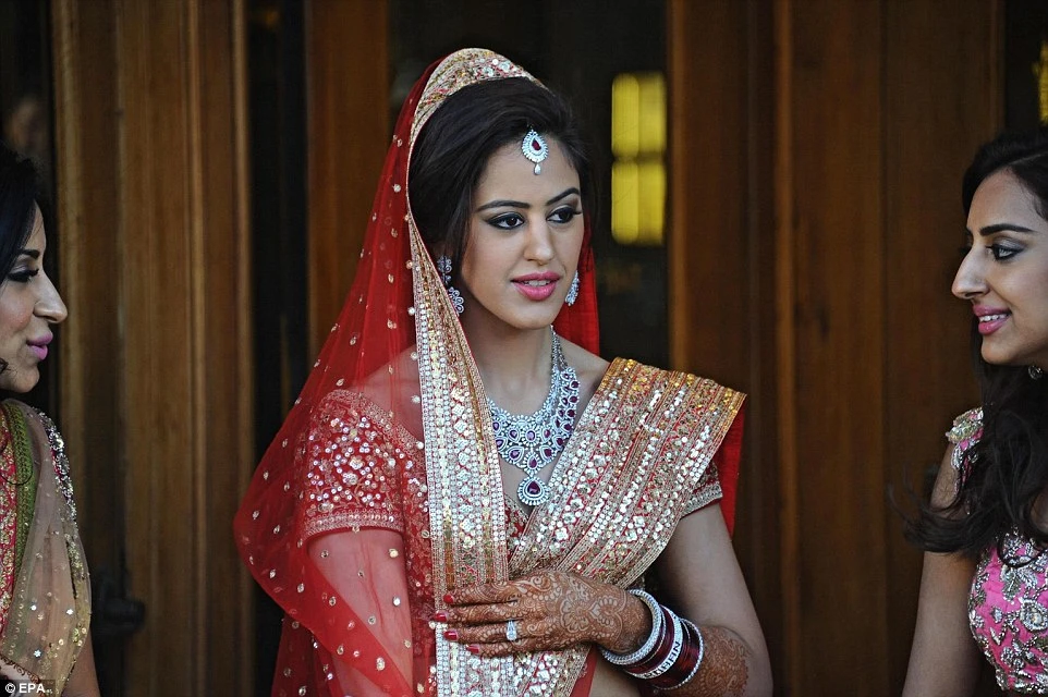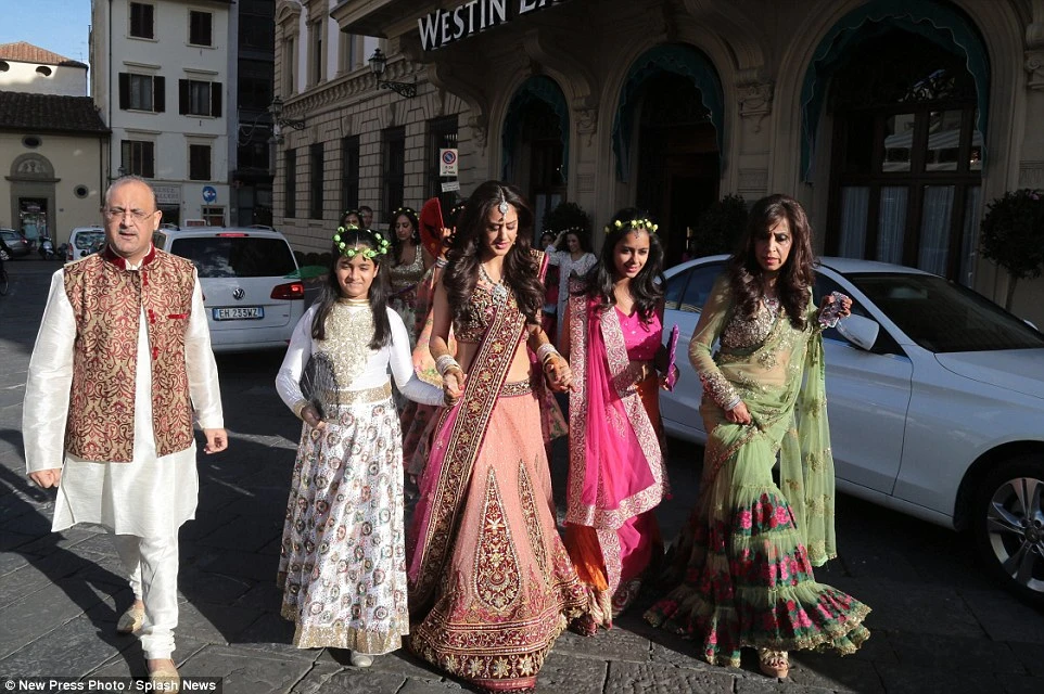 Hôm 28-11, cô dâu xuất hiện từ một khách sạn trên sông Arno, mặc áo sari truyền thống của Ấn Độ và dắt tay một số các vị khách nhỏ tuổi. Sau đó cặp đôi mới cưới đã hưởng một bữa tiệc xa hoa và nhảy múa tại một địa điểm lịch sử trong thành phố.