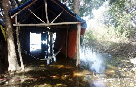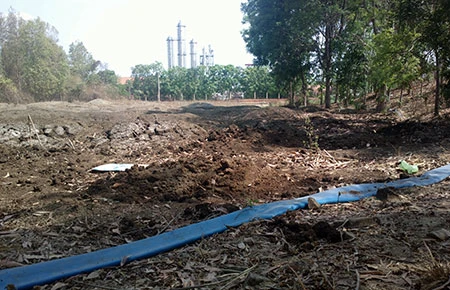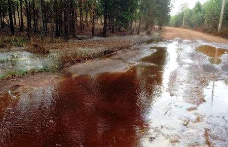 Vượt qua ngọn đồi dày đặc rừng bạch đàn bên phải cổng nhà máy chỉ vài trăm mét đã nghe mùi tanh lợm giọng. Từ xa nước thải vàng khè chảy ào ạt thành dòng rồi đọng thành nhiều vũng lớn nổi váng xanh lè. Ngược theo dòng chảy, chúng tôi phát hiện một ống mềm màu xanh to đùng như một con trăn dài khoảng nửa cây số được dẫn từ nhà máy ra và được chôn ngầm dưới con lộ đất đỏ cặp bên hông nhà máy.