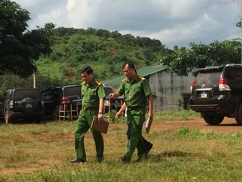 Đại tá Nguyễn Ngọc Chương, Giám đốc Công an tỉnh Đắk Nông, cũng có mặt tại hiện trường báo cáo với Thứ trưởng Phạm Dũng việc triển khai các biện pháp điều tra, xử lý vụ án.
