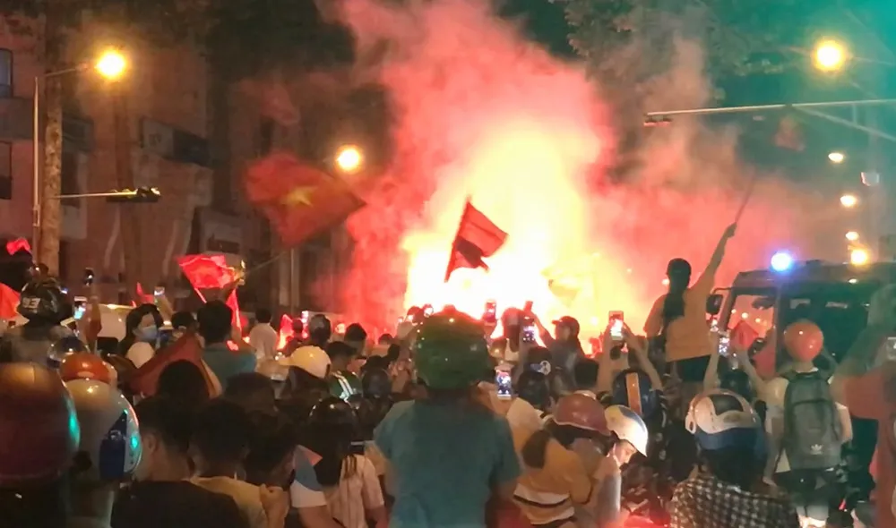 Khoảng 22 – 23 giờ tối nay, trong dòng người xuống đổ xuống dường cổ vũ đội tuyển nước nhà sau trận chung kết lượt về AFF Cup, đã có nhiều cổ động viên quá khích đốt pháo sáng rực trên tuyến đường Trần Hưng Đạo, quận 1.