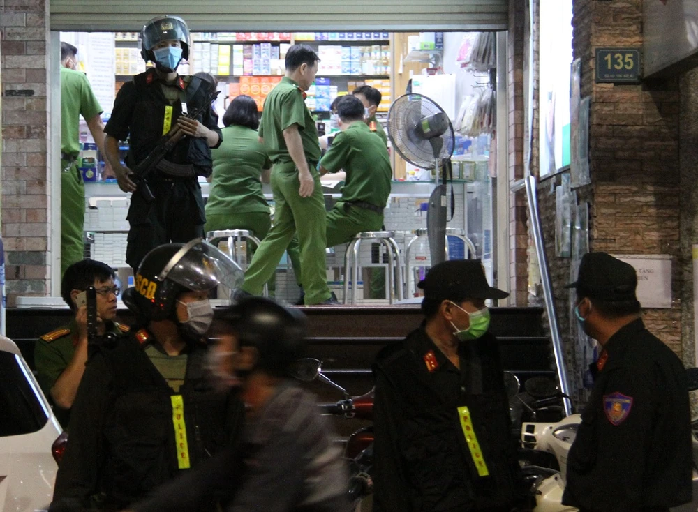 Chiều cùng ngày, hàng chục cảnh sát cơ động vây quanh trụ sở Công ty TNHH dược phẩm Sơn Minh và nhà thuốc Minh Sơn (đường Phan Đình Phùng, phường Trung Dũng, TP Biên Hòa) để cảnh sát kinh tế tiến hành khám xét, làm việc.