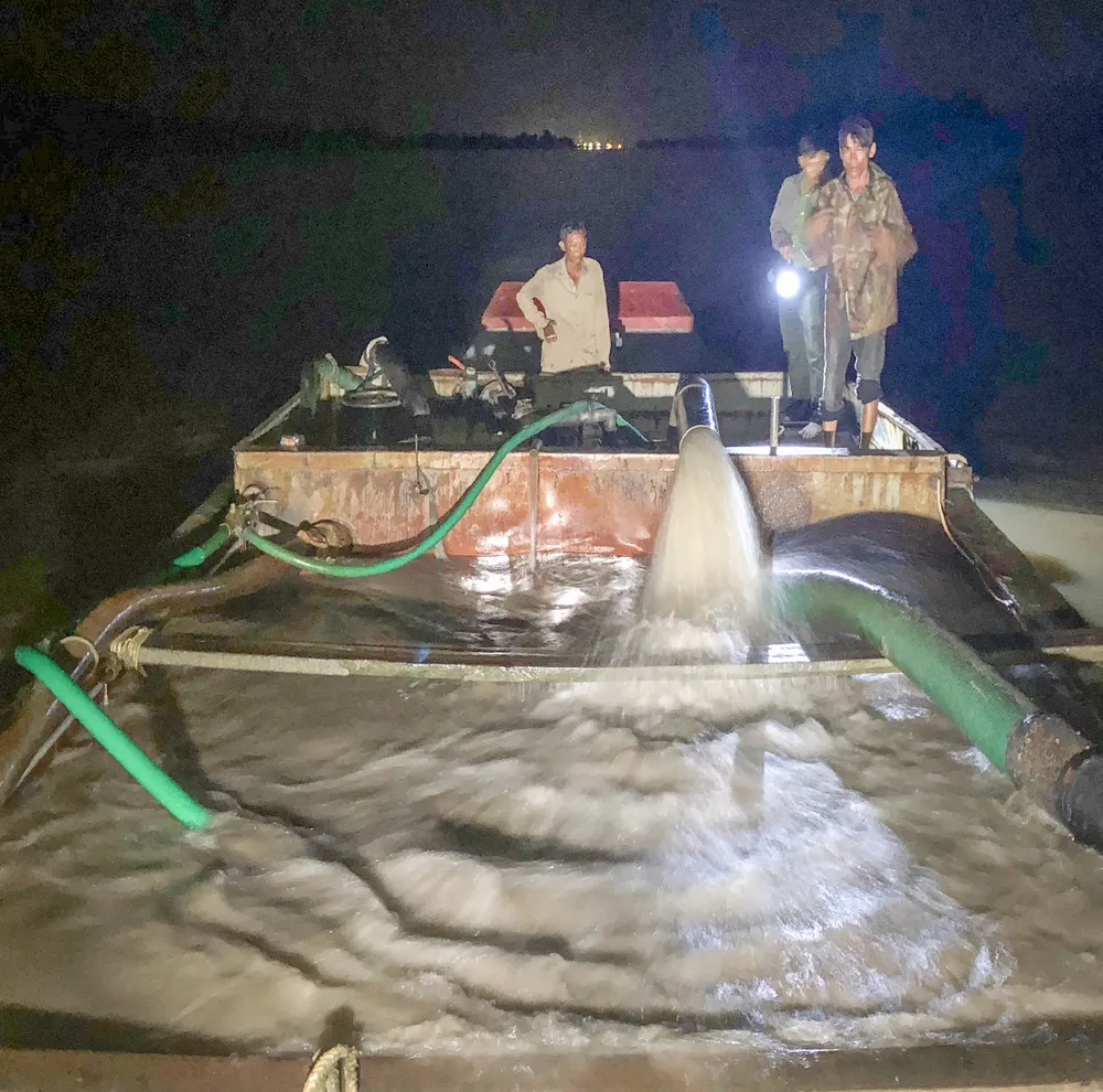 Theo đó, khoảng 21 giờ ngày 24-8, trong lúc tuần tra trên sông Hậu (đoạn thuộc xã An Lạc Tây, huyện Kế Sách), lực lượng chức năng bắt quả tang năm người đang sử dụng các thiết bị để hút cát dưới sông lên ba phương tiện.