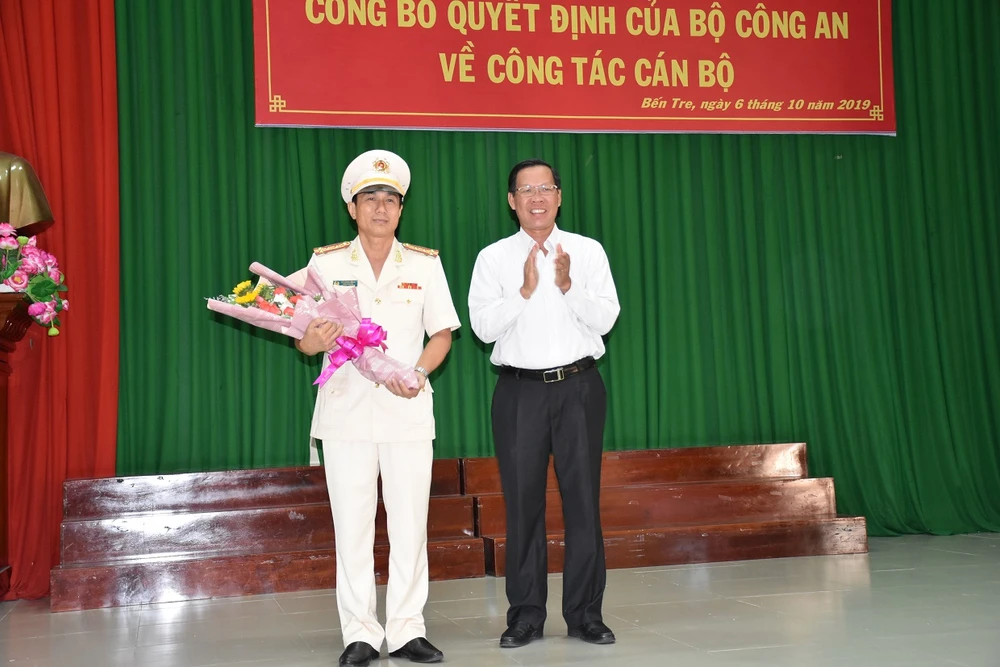 Bí thư Tỉnh ủy Bến tre Phan Văn Mãi tặng hoa chúc mừng tân giám đốc công an tỉnh.