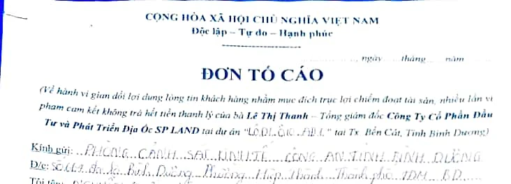 Trong một diễn biến khác, vào sáng 3-8, bà Lê Thị Thanh, Tổng giám đốc công ty SP Land cũng đến Phòng Cảnh sát kinh tế, Công an tỉnh Bình Dương, để nộp đơn tố cáo những người đã lừa đảo bà hàng chục tỉ đồng.