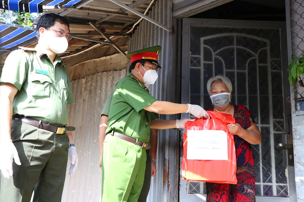 Thiếu tướng Đinh Thanh Nhàn trao quà cho hộ dân gặp khó khăn do dịch COVID-19 trên địa bàn phường 13, quận Bình Thạnh. Ảnh: NY
