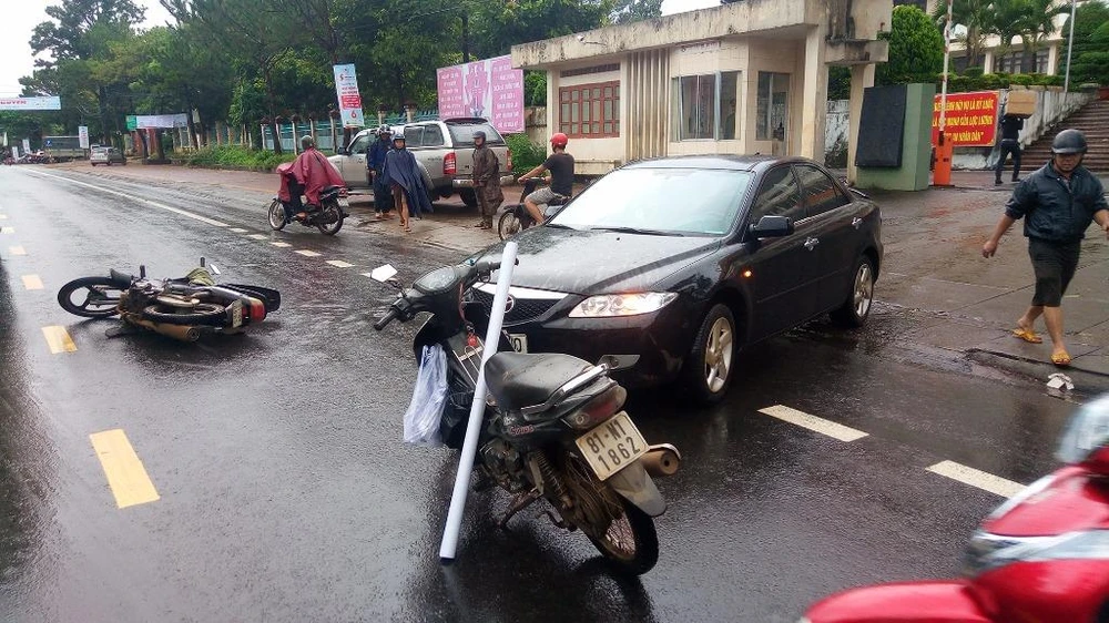 Người này đã va quẹt với ô tô 81M-5300 do một cán bộ Công an tỉnh Gia Lai lái từ trụ sở vừa ra đường. Hậu quả, người đàn ông điều khiển xe máy bị ngất xỉu tại chỗ, ô tô bị móp biển số.