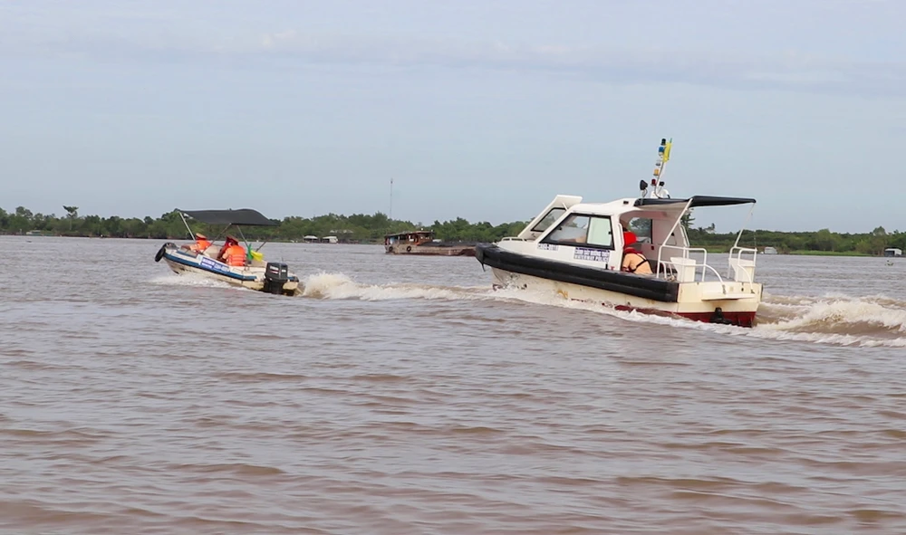Cảnh sát giao thông đường thủy Công an tỉnh Vĩnh Long tuần tra kiểm soát ngăn chặn khai thác cát sông trái phép trên các tuyến giao thông.