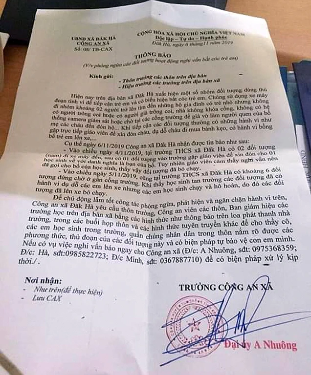 Trong thông báo đến các trường học và nhân dân về việc xuất hiện nhiều người lạ mặt có biểu hiện dụ dỗ nhằm bắt cóc học sinh của Công an xã Đăk Hà cũng cho hay đã có một số dấu hiệu nghi vấn.
