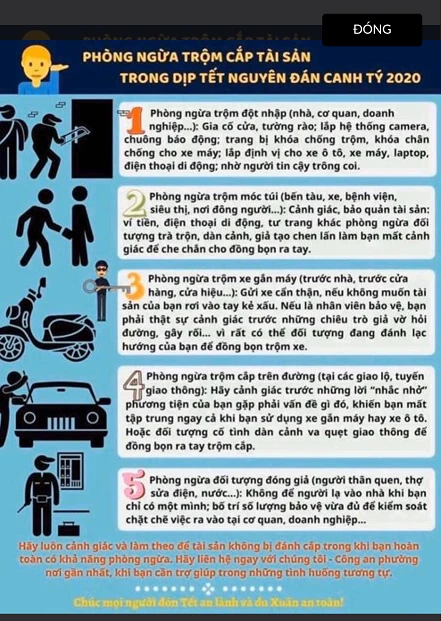 Phường cũng cung cấp thêm năm cách để phòng ngừa trộm cắp tài sản trong dịp tết Canh Tý đã được công an lưu ý trước đó. Cụ thể:
