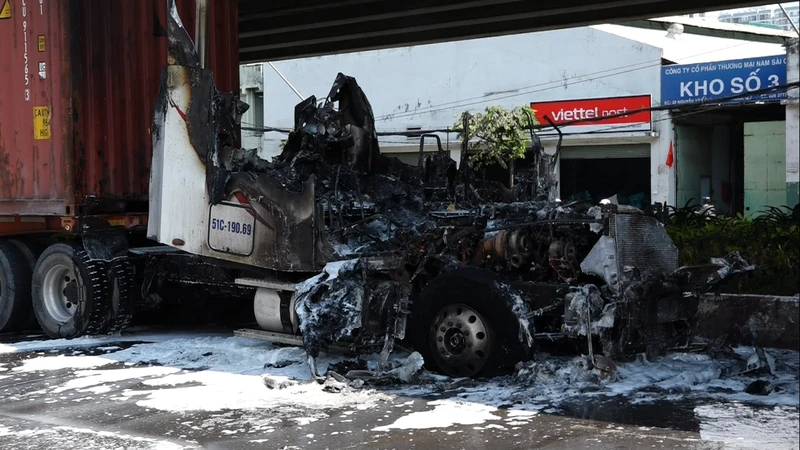 Gần đây nhất, chiều ngày 4-3-2021, xe container đang lưu thông dưới chân cầu Phú Mỹ địa bàn quận 7 đã cháy rụi phần cabin.