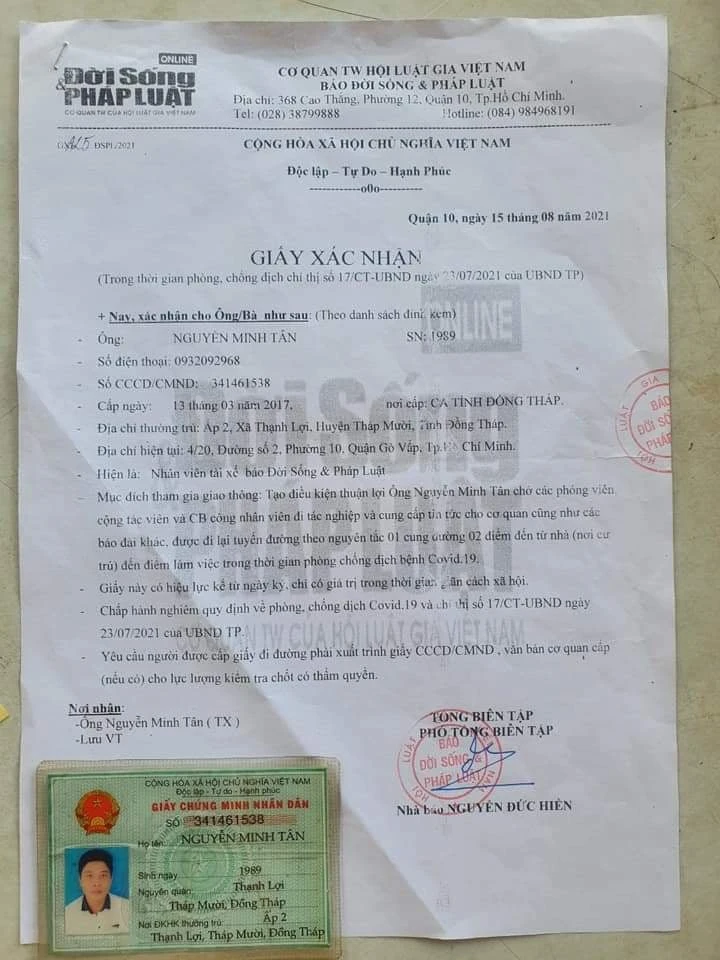 Trước đó, PLO đã đưa tin, Đội CSGT An Sương trong lúc làm nhiệm vụ tại chốt kiểm soát cầu Phú Cường đã dừng một ô tô có nhóm người xuất trình giấy xác nhận có tên Nguyễn Minh Tân (32 tuổi, cư trú quận Gò Vấp) của Tạp chí Đời Sống & Pháp Luật với chữ ký Phó Tổng biên tập Nguyễn Đức Hiển.