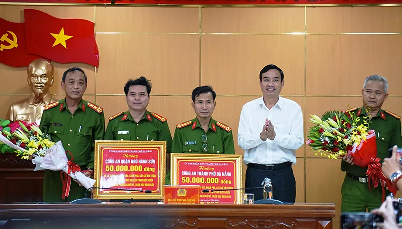 Ông Lê Trung Chinh, Phó Chủ tịch UBND TP Đà Nẵng, trao thưởng nóng cho lực lượng công an phá án. Ảnh: HẢI HIẾU