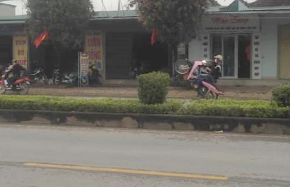 Trong đó, thanh niên chạy xe máy màu hồng và hai thanh niên đi trên một xe máy màu trắng không đội mũ bảo hiểm cùng “bốc đầu” trên quốc lộ 7A (đoạn qua huyện Anh Sơn). Việc chạy xe máy “bốc đầu” vi phạm luật giao thông, gây nguy hiểm cho người đi đường và các phương tiện.