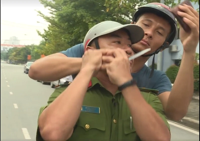 Clip công an hướng dẫn kẻ cướp xe máy. Ảnh cắt từ clip